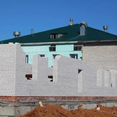 На объекте уже завершены фундаментные работы, ведётся кирпичная кладка стен и перегородок первого этажа. Работы идут по графику.